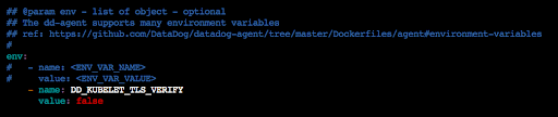 For quick testing purpose, disable TLS authentication with Kubernetes API server for Datadog by update Datadog helm chart’s values.yaml and update Datadog agent with helm upgrade command in order to make the Datadog agent to work: