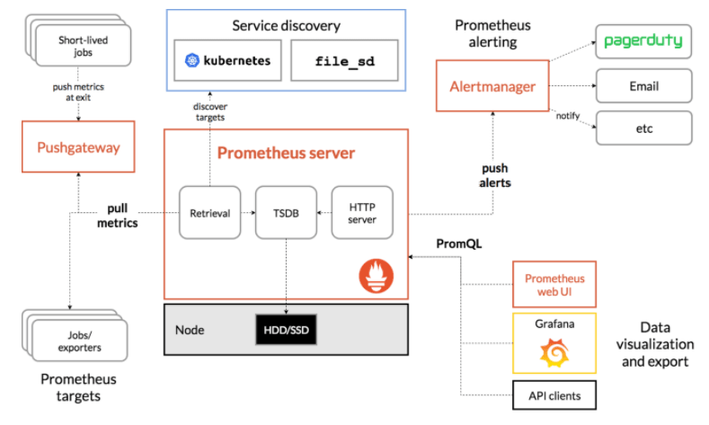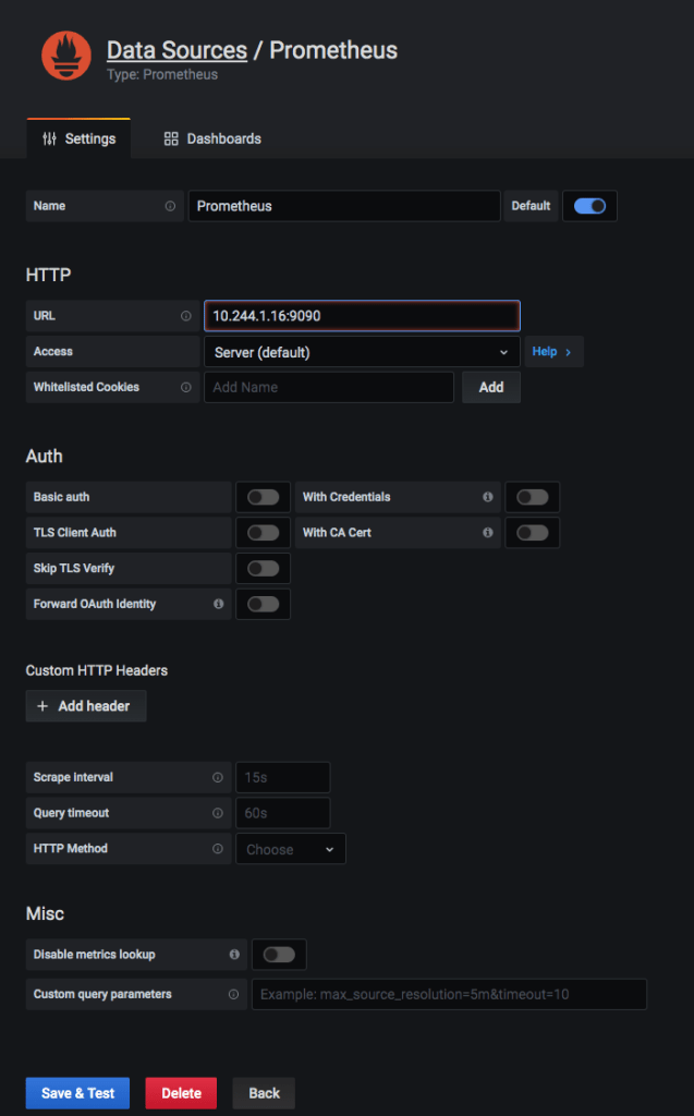 In order to let Prometheus to monitor your application besides the infrastructure components, you have to add prometheus data feeding capacity into your containerized application by using its SDK library, instrument your application with prometheus.io/scrape: ‘true’ and prometheus.io/port” ‘9090’ annotations. For example, by following yaml descriptive file, you can deploy a service with its according deployment with above annotations to monitor the performance specific to your deployed application.