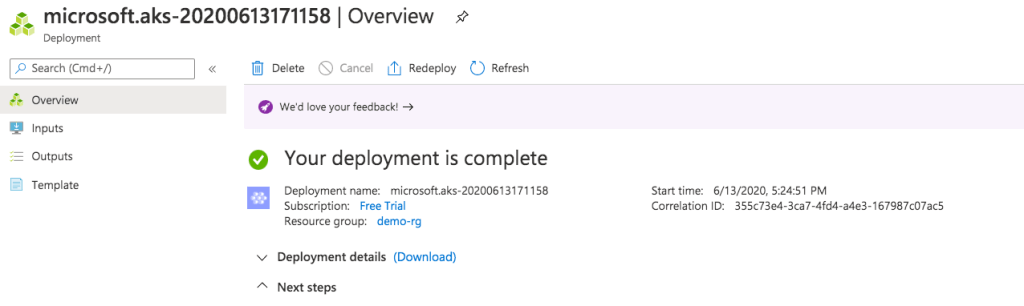 This can be done either using Azure CLI or its GUI interface following a couple of easy steps. Here is the deployed Kubernetes cluster inside my Azure account using GUI interface from the quick start session:
