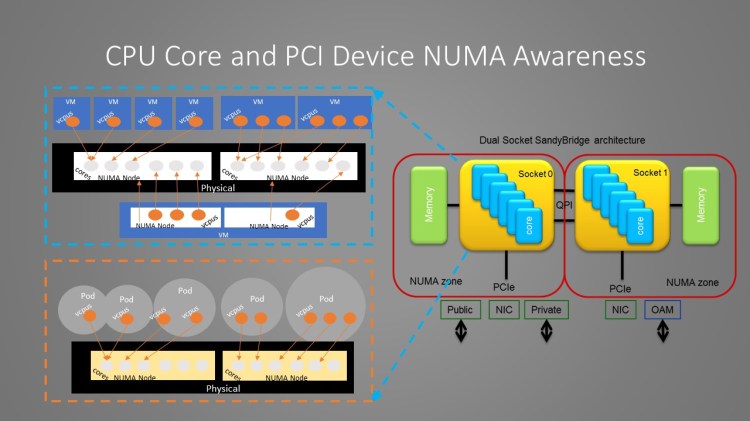 In modern Intel Xeon architecture, there are multiple CPU sockets, each with multiple cpu cores, each socket has its directly attached memory chips, PCI devices (PCI NIC card, GPU, co-processors). This is called NUMA(non-uniform Memory Architecture) in Intel’s term. EPA is realized to reserve a certain number of dedicated cpu cores to run your application and pin those cores to be co-located in the same socket where the memory, cache and network interface PCI card your application running from are all attached to the same cpu socket or NUMA node. This will give your application the best performance. Of course, applications can use resources such as memory, PCI devices attached to other CPU NUMA nodes. But, the side effect is that all data packets and memory access must go through the mesh connectors between different sockets: the QPI interface, which has capped bandwidth and this will become the performance bottom neck of your applications . The EPA principle can be illustrated by following diagrams:
