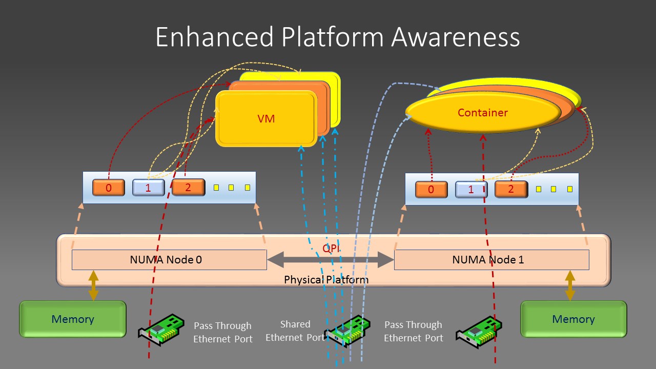 EPA (Enhanced Platform Awareness) can help to improve the performance of crucial applications. It did this by allocating dedicated computing resources including cpu cores, memory page, cache memory, dedicated networking interface resource to the VM or container and giving the exclusive usage of those resources to those performance sensitive crucial applications. After those reservations, the rest of platform resources can be shared between other virtual machines and containers.